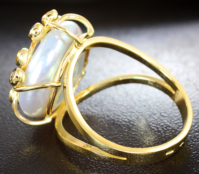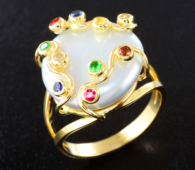 Вашему вниманию предлагается комплект (кольцо + серьги) из желтого золота 585 пробы с морским жемчугом барокко 34,55 карата, цаворитами гранатами и сапфирами! Размеры жемчуга 16 х 16 мм 17 х 17 мм, диаметр дополнительной инкрустации от 2 мм до 2,2 мм. Вес комплекта 18 г.