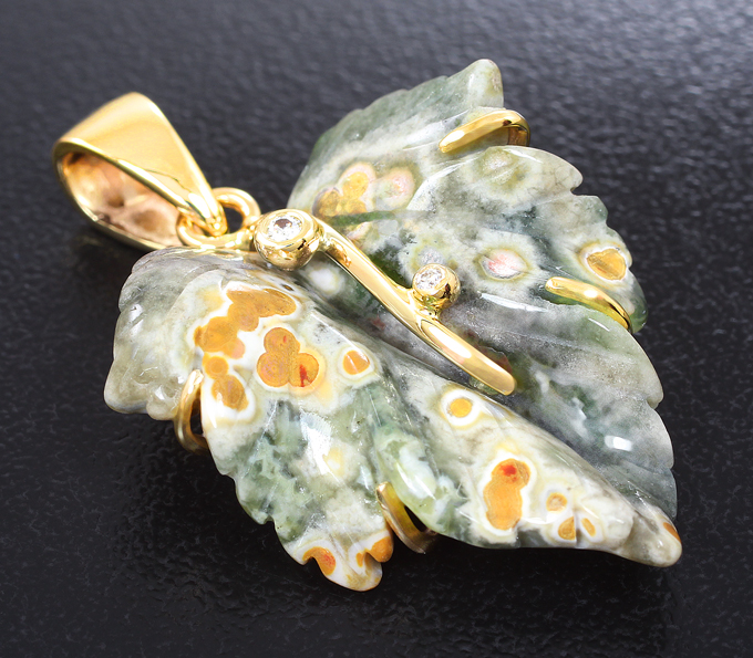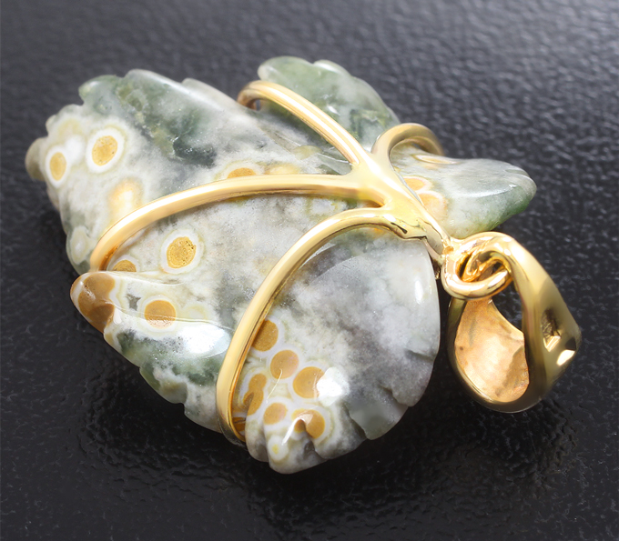 Вашему вниманию предлагается кулон из желтого золота 585 пробы с резным матированным агатом и бриллиантами! Диаметр дополнительной инкрустации 1,1 мм и 1,5 мм. Размеры кулона с петлей 34 х 21 мм. Вес изделия 4,35 г. Ниже приводятся ювелирные характеристики агата.