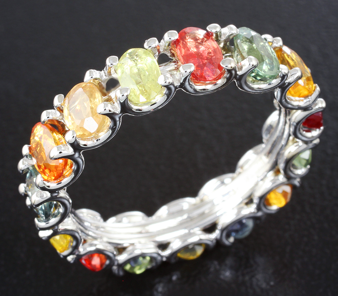 Вашему вниманию предлагается кольцо из белого золота с разноцветными сапфирами 5,03 карата! Размеры вставок 5 х 3 мм. Ширина площадки 4 мм, высота 3 мм. Вес изделия 4,3 г. Размер 18.