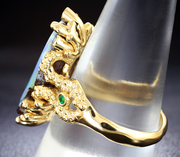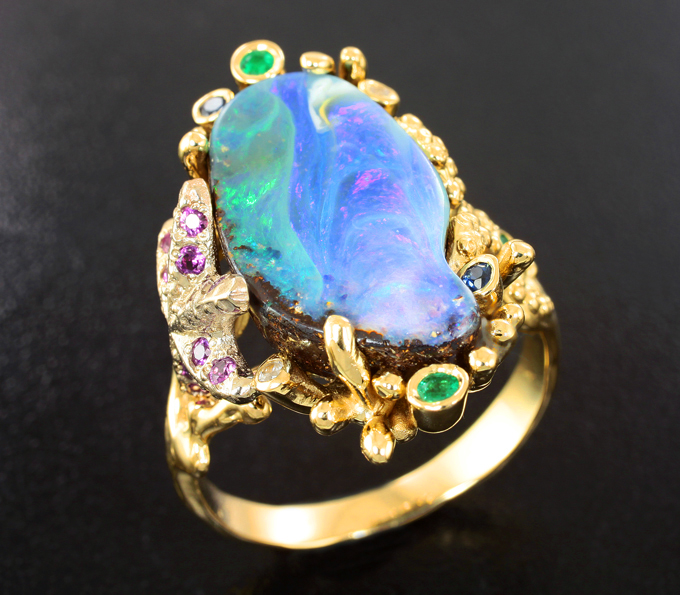 Кольцо с австралийским болдер опалом 13,48 карата, изумрудами, розовыми, синими и бесцветными сапфирами