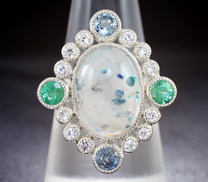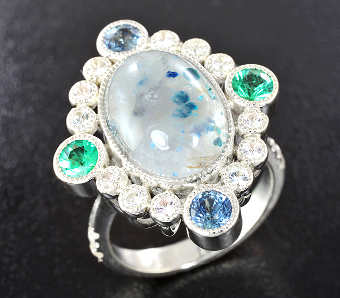 Кольцо с «медузным» кварцем с гилалитом 7,62 карта, изумрудами, голубыми и бесцветными сапфирами