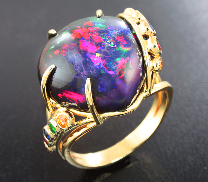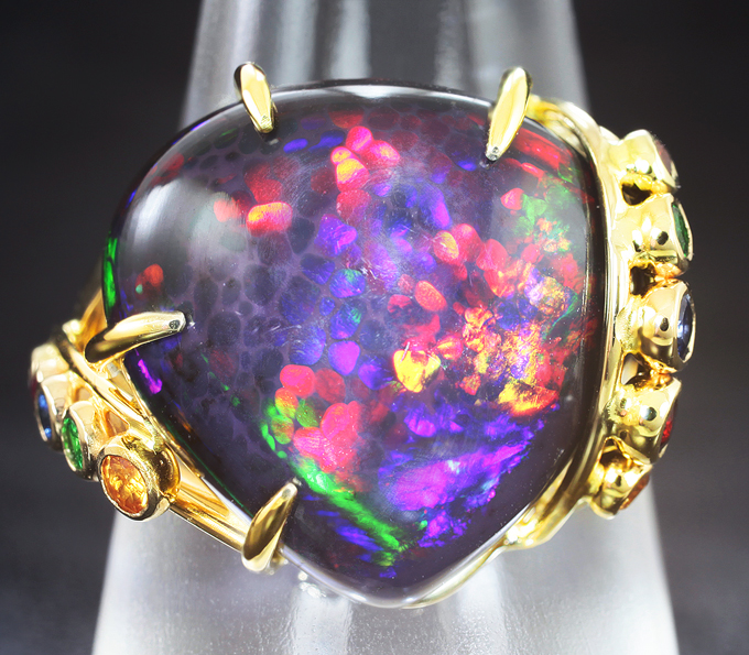 Кольцо с кристаллическим черным опалом 15,14 карата, разноцветными сапфирами и цаворитами гранатами