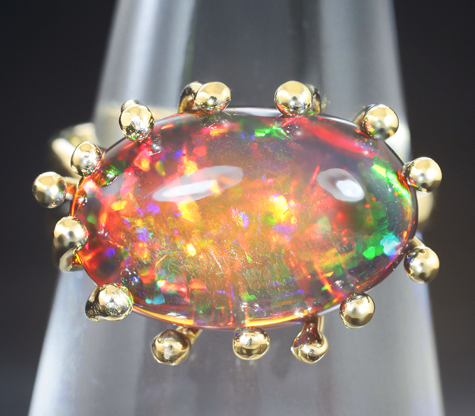 Вашему вниманию предлагается кольцо из желтого золота 585 пробы с кристаллическим черным опалом 4,23 карата! Основные цвета опалесценции: красный, желтый, зеленый и синий. Размеры вставки 14 х 10 мм. Площадка 18 х 13 мм, высота 7 мм. Вес изделия 4,1 г. Размер 17,5.
