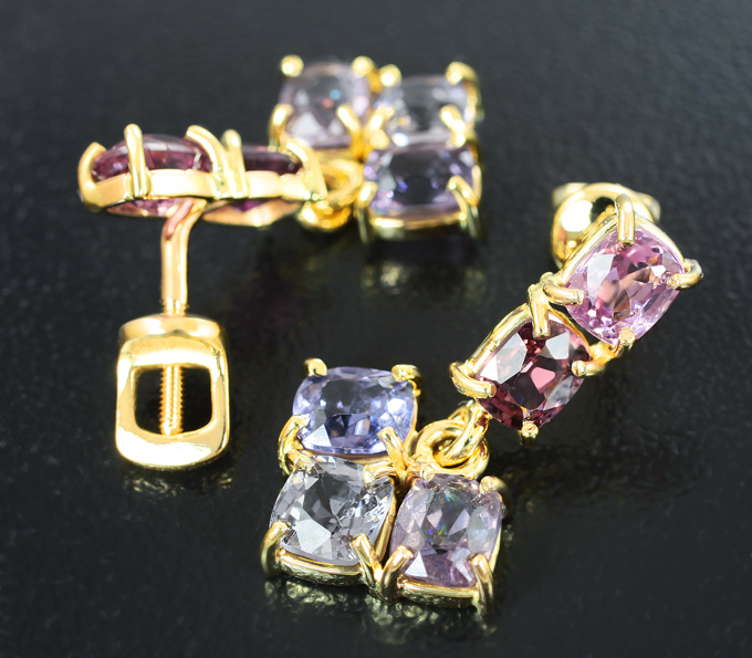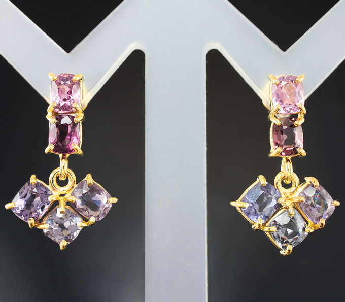 Вашему вниманию предлагаются серьги из жетого золота 585 пробы с разноцветными шпинелями! Площадка серег 23 х 14 мм. Вес пары 4,6 г. Ниже приводятся ювелирные характеристики вставок.