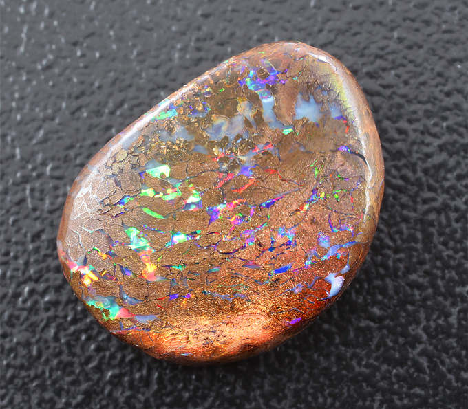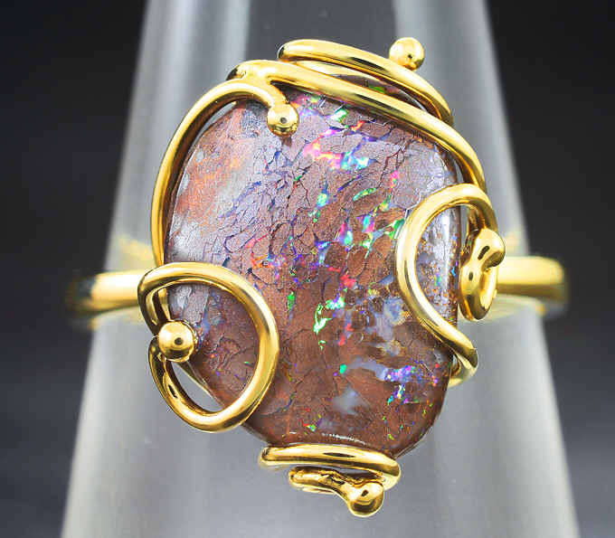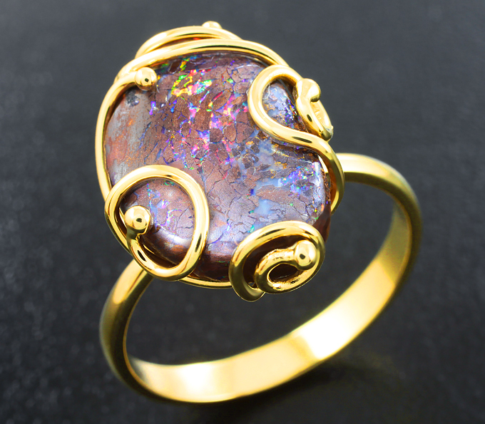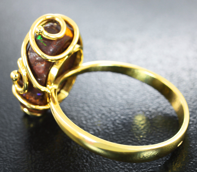 Вашему вниманию предлагается кольцо из желтого золота 585 пробы с австралийским болдер опалом! Яркая опалесценция всеми цветами радуги! Площадка 17 х 13 мм, высота 7 мм. Вес изделия 4,5 г. Размер 19. Ниже приводятся ювелирные характеристики вставки.