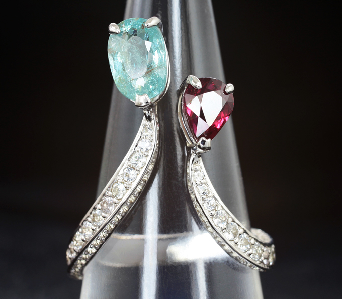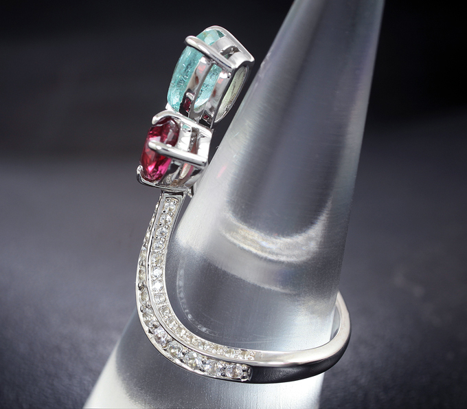 Кольцо с медьсодержащим голубым параиба турмалином, рубином и лейкосапфирами