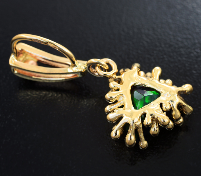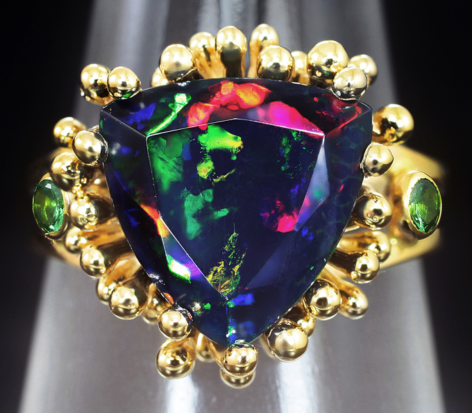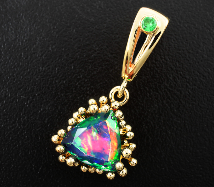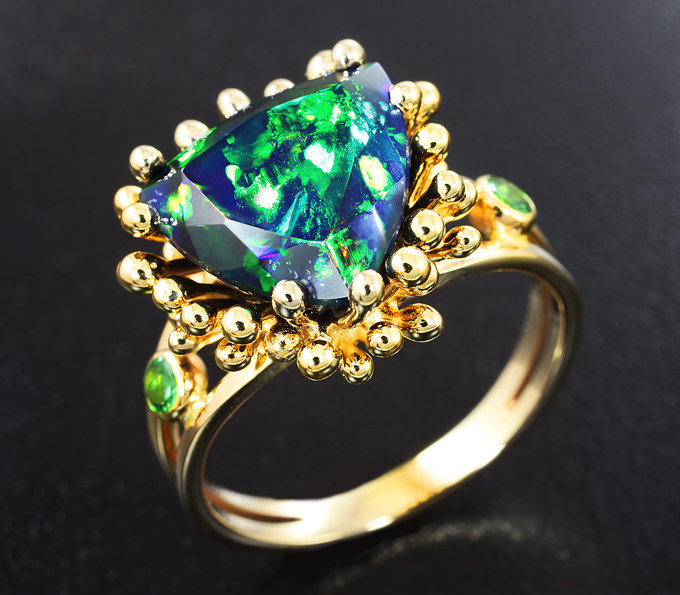 Вашему вниманию предлагается комплект (кольцо + кулон) из желтого золота 585 пробы с ограненными черными опалами и цаворитами гранатами! Основные цвета опалесценции: красный, желтый, зеленый и синий. Размеры вставок 2,5 мм и 11 х 11 мм. Вес комплекта 8,6 г.