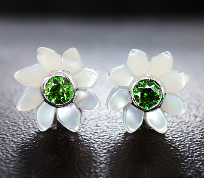 Вашему вниманию предлагаются пусеты из белого золота 585 пробы с уральскими демантоидами и перламутром! Площадка пусет 10 х 10 мм. Вес пары 2,6 г. Ниже приводятся ювелирные характеристики демантоидов.