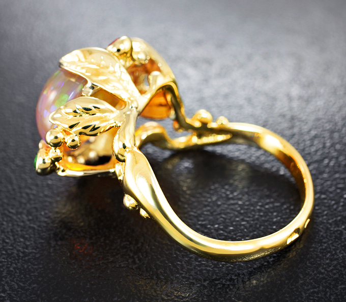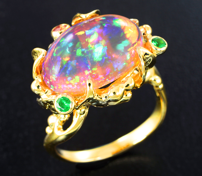 Кольцо c кристаллическим эфиопским опалом, оранжевым сапфиром и цаворитами гранатами