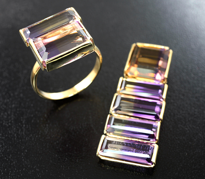 Вашему вниманию предлагается комплект (кольцо + кулон) из желтого золота 585 пробы с аметринами! Вес комплекта 10,5 г.