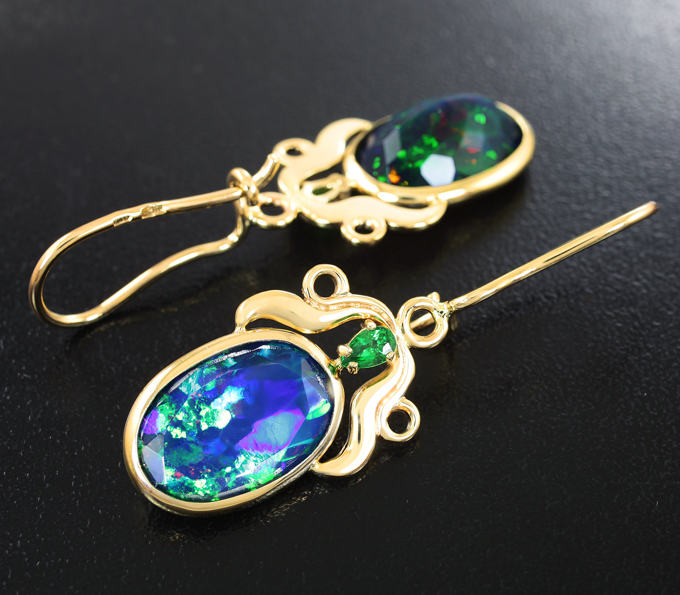 Серьги с ограненными черными опалами 8,6 карата и цаворитами гранатами