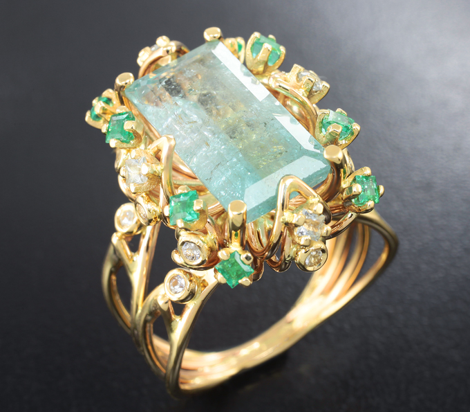 Кольцо c редким голубым турмалином 7,16 карата, изумрудами и лейкосапфирами