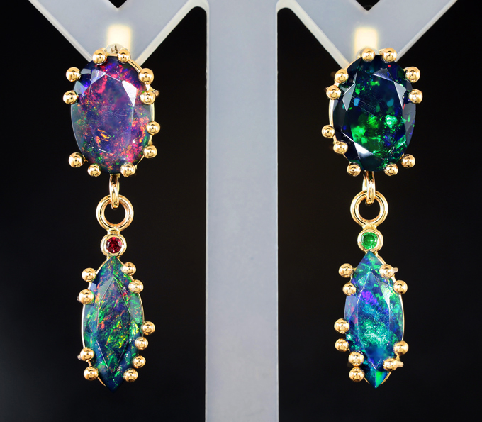 Cерьги с ограненными черными опалами, цаворитами гранатами и красными сапфирами