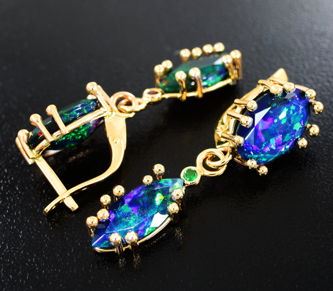 Вашему вниманию предлагаются серьги из желтого золота 585 пробы с ограненными черными опалами, цаворитами гранатами и красными сапфирами! Основные цвета опалесценции: зеленый, синий и фиолетовый. Диаметр дополнительной инкрустации 2 мм. Размеры серег с петлей 37 х 11 мм. Вес пары 6,94 г. Ниже приводятся ювелирные характеристики вставок.