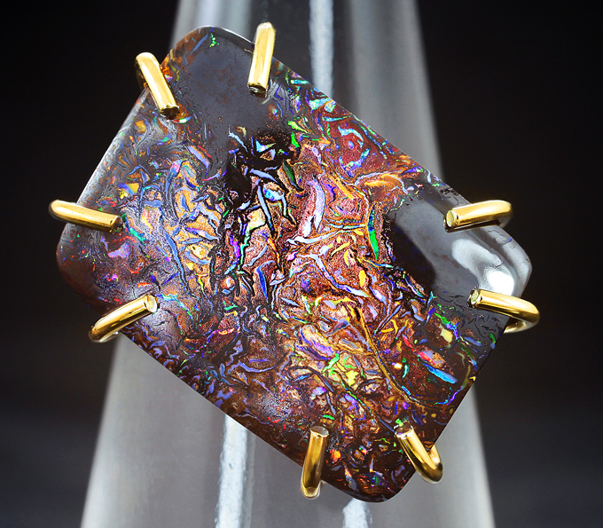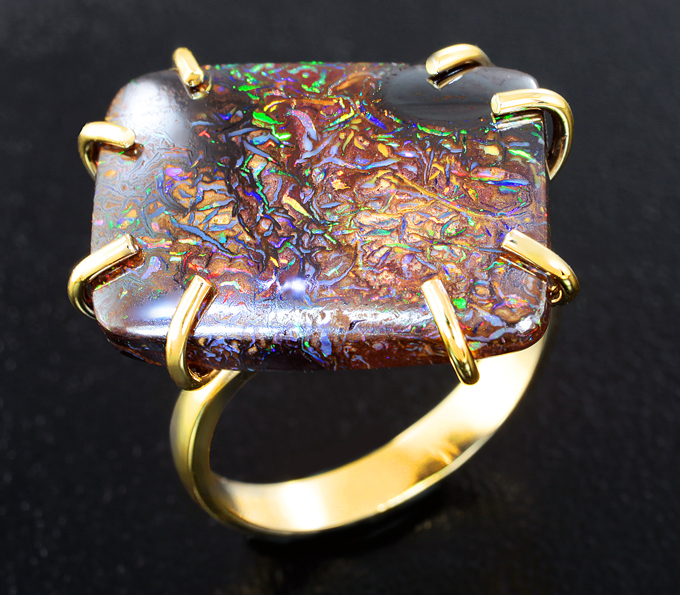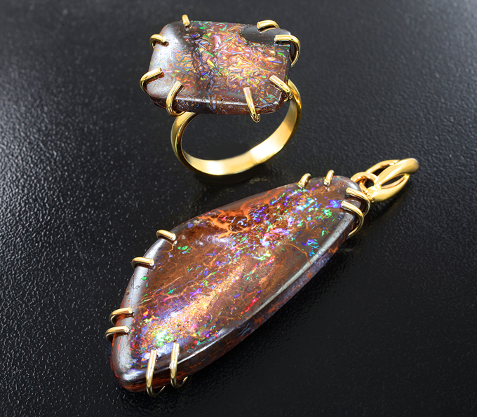 Вашему вниманию предлагается комплект (кольцо + кулон) из желтого золота 585 пробы с австралийскими болдер опалами! Многоцветная бриллиантовая опалесценция красным, желтым, зеленым, синим и фиолетовым цветами. Вес комплекта 15,6 г.