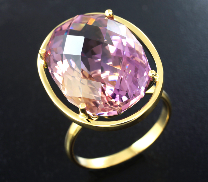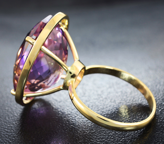 Вашему вниманию предлагается кольцо из желтого золота 585 пробы c чистейшим аметрином авторской огранки! Площадка 24 х 18 мм, высота 15 мм. Вес изделия 7,5 г. Размер 18. Ниже приводятся ювелирные характеристики вставки.