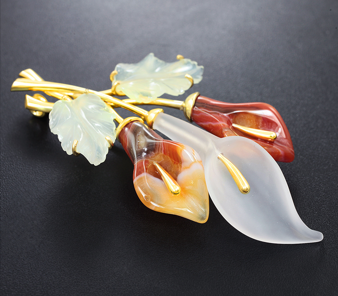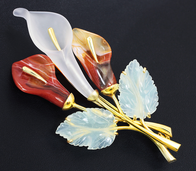 Брошь c резным кварцем 46,82 карата и миниатюрами из цельного мексиканского агата 28,25 карата