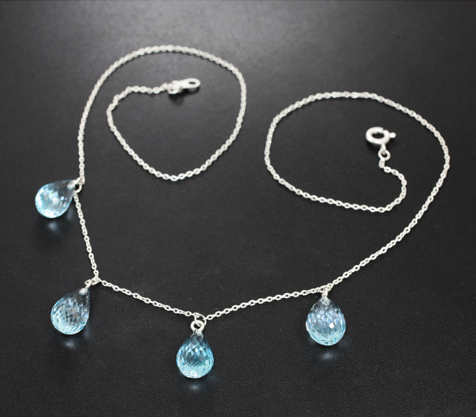 Вашему вниманию предлагается колье из стерлингового серебра (925 проба) с бриолетами голубых топазов! Длина по цепочке 465 мм. Вес изделия 6,9 г. Ниже приводятся ювелирные характеристики вставок.