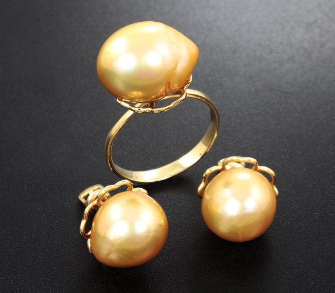 Вашему вниманию предлагается комплект (кольцо + пусеты) из желтого золота 585 пробы с морским жемчугом барокко! Вес комплекта 14 г.