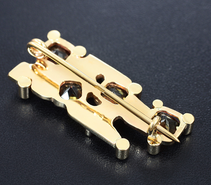 Вашему вниманию предлагается брошь из желтого золота 585 пробы с андалузитами и сапфирами! Диаметр дополнительной инкрустации 1,1 мм и 2 мм. Площадка 31 х 13 мм. Вес изделия 5,7 г. Ниже приводятся ювелирные характеристики вставок.