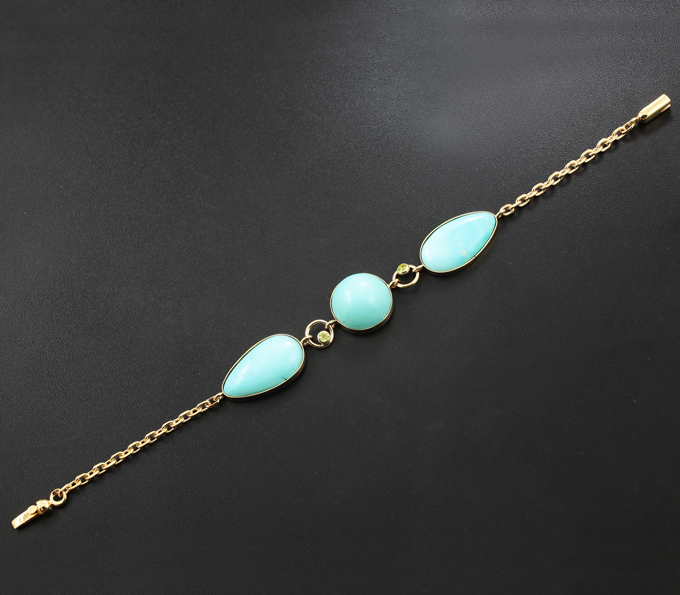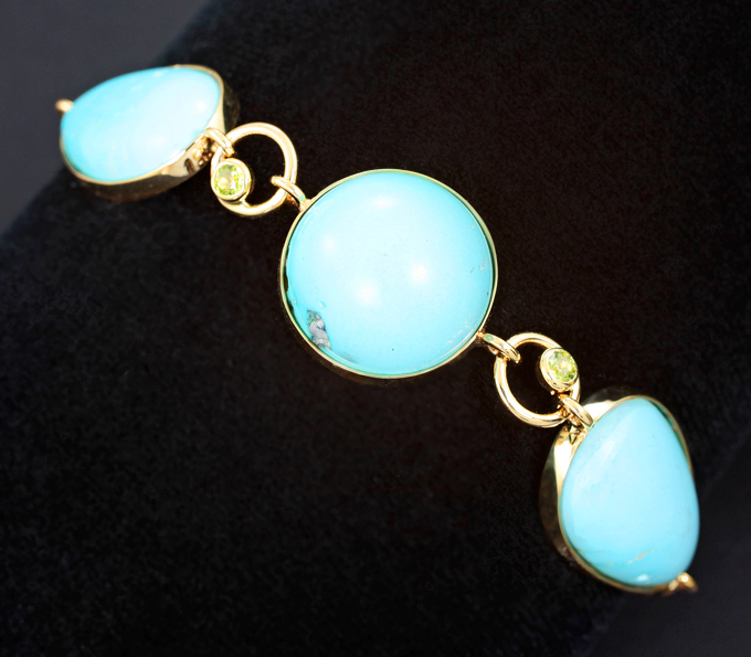 Вашему вниманию предлагается браслет из желтого золота 585 пробы с кабошонами армянской бирюзы и перидотами! Диаметр дополнительной инкрустации 2,5 мм. Длина браслета 185 мм, ширина 16 мм. Вес изделия 11,4 г. Ниже приводятся ювелирные характеристики бирюзы.