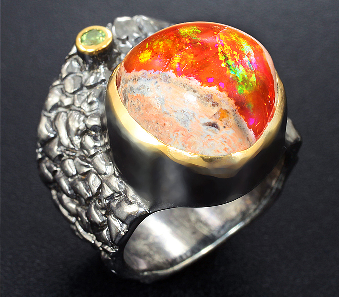 Вашему вниманию предлагается комплект (кольцо + кулон) из стерлингового серебра (925 проба) с мексиканскими jelly опалами и перидотами! Изделия с чернением и позолотой. Диаметр дополнительной инкрустации 2,5 мм и 3 мм. Вес комплекта 24,1 г.