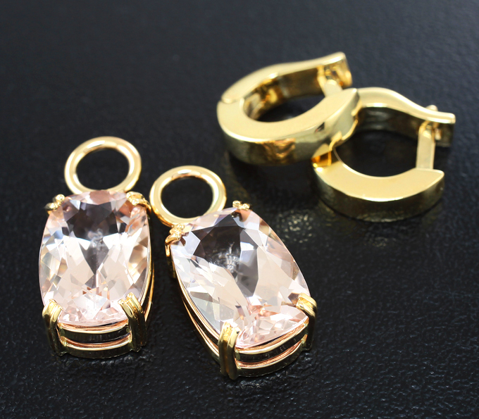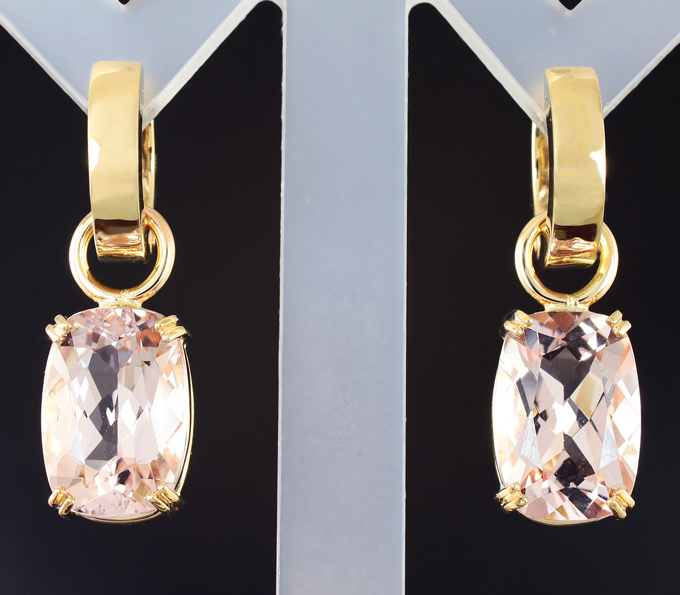 Вашему вниманию предлагаются серьги из желтого золота 585 пробы с морганитами 8,97 карата! Размеры вставок 13 х 9 мм. Размеры серег с петлей 30 х 9 мм. Вес пары 9,1 г.