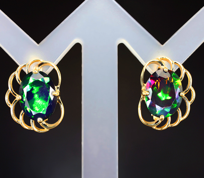 Вашему вниманию предлагаются серьги из желтого золота 585 пробы с ограненными черными опалами! Основные цвета опалесценции: красный, желтый и зеленый. Площадка серег 16 х 12 мм. Вес пары 4 г. Ниже приводятся ювелирные характеристики вставок.