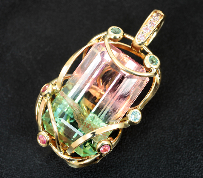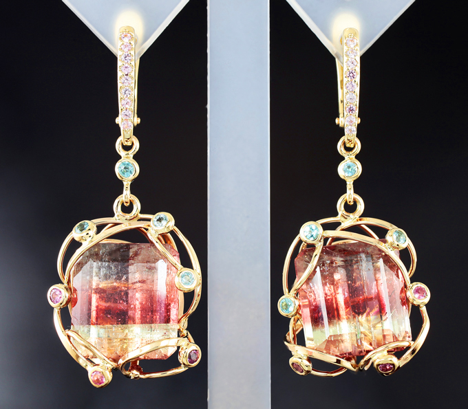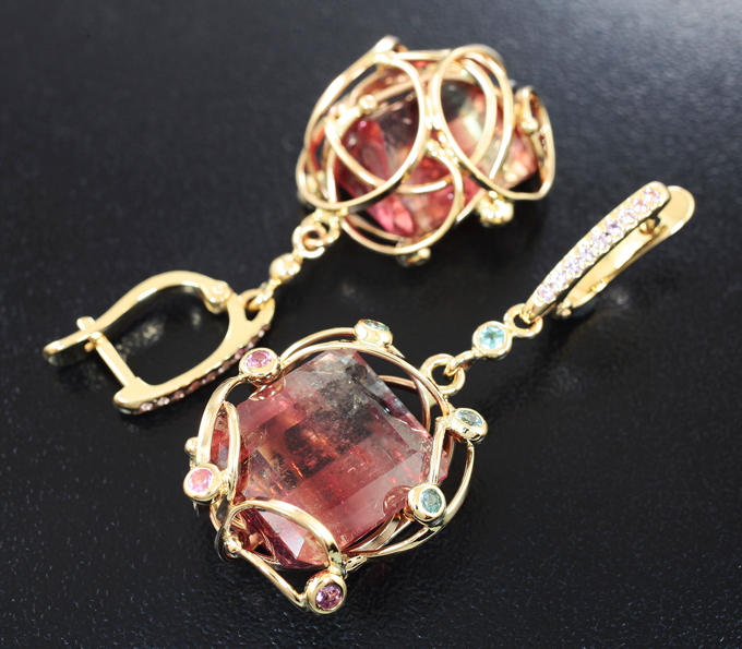 Вашему вниманию предлагается комплект (серьги + кулон) из желтого золота 585 пробы с турмалинами, розовыми сапфирами и апатитами! Диаметр дополнительной инкрустации 1,25 мм и 2 мм. Вес комплекта 22 г.
