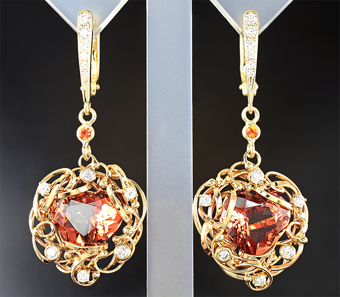 Серьги с чистейшими андезинами 10,14 карата, оранжевыми сапфирами и бриллиантами