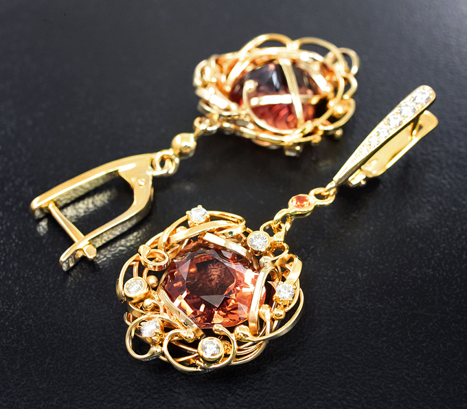 Вашему вниманию предлагаются серьги из желтого золота 585 пробы с чистейшими андезинами, оранжевыми сапфирами и бриллиантами! Диаметр дополнительной инкрустации от 1,1 мм до 2,5 мм. Размеры серег с петлей 48 х 20 мм. Вес пары 11,2 г. Ниже приводятся ювелирные характеристики андезинов.