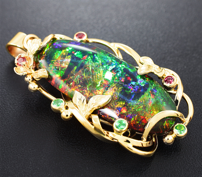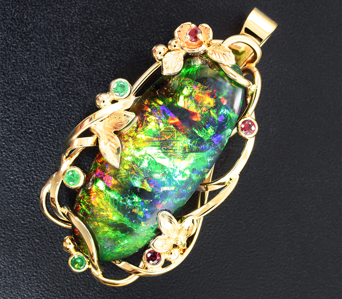 Кулон с крупным кристаллическим черным опалом 14,2 карата, красными сапфирами и цаворитами гранатами