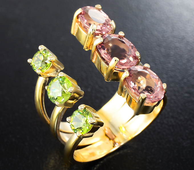 Кольцо с уральскими демантоидами гранатами 1,08 карата и апатитами падпараджа 3,74 карата