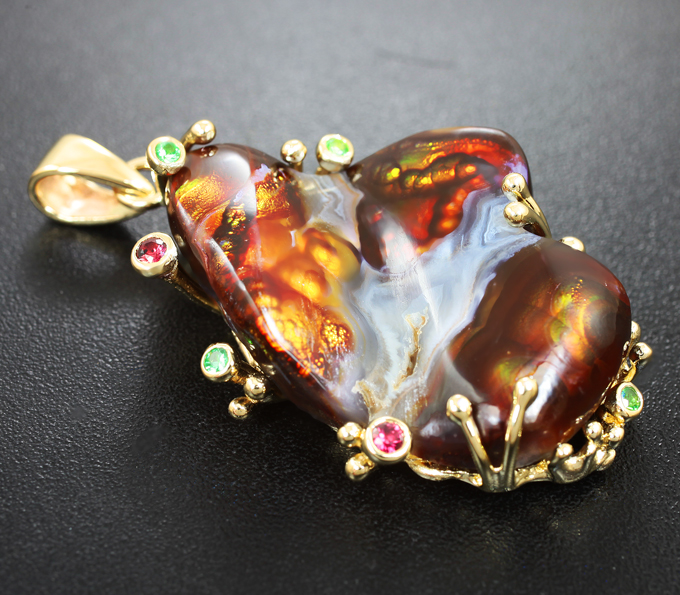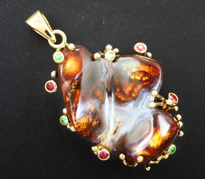 Кулон с крупным мексиканским огненным агатом 37,59 карата, цаворитами гранатами и красными сапфирами