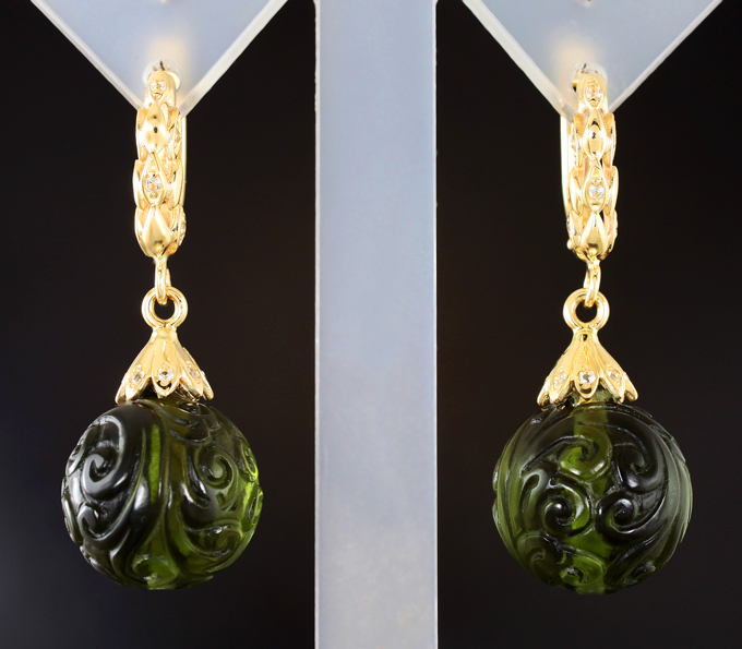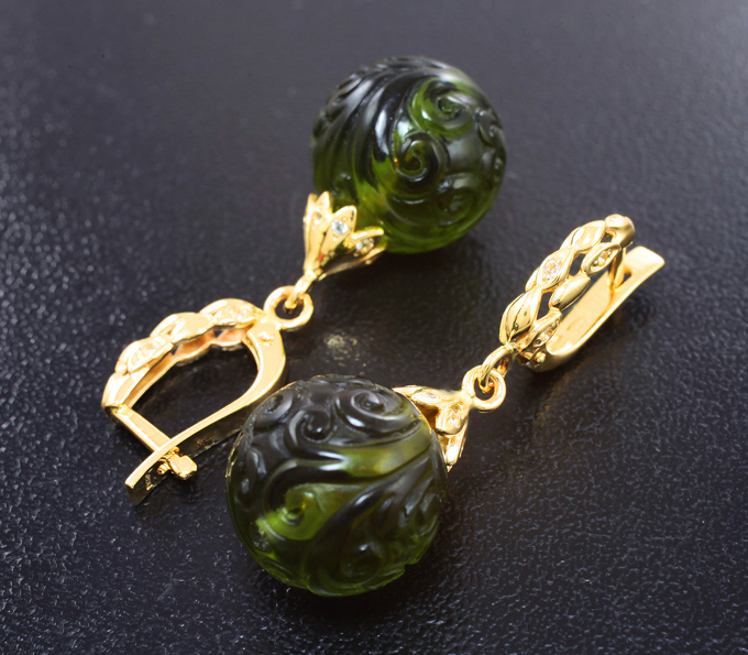 Серьги с резными молдавитами 26,84 карата и бесцветными топазами