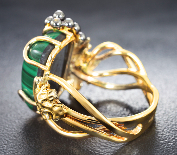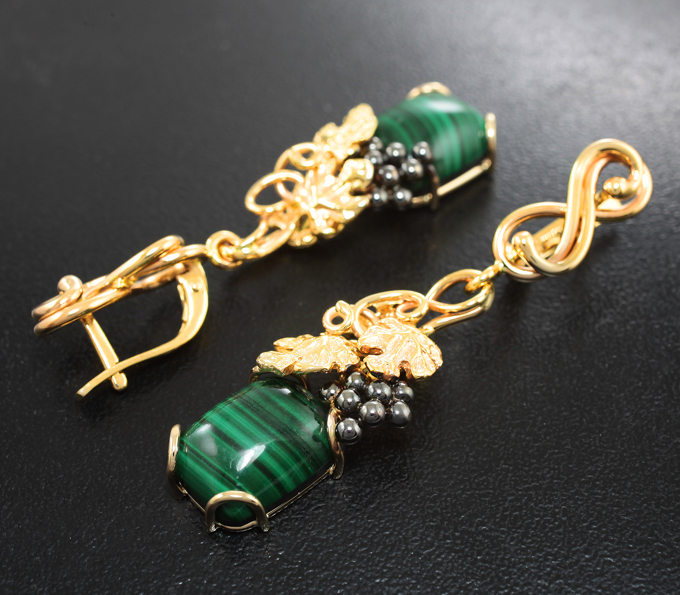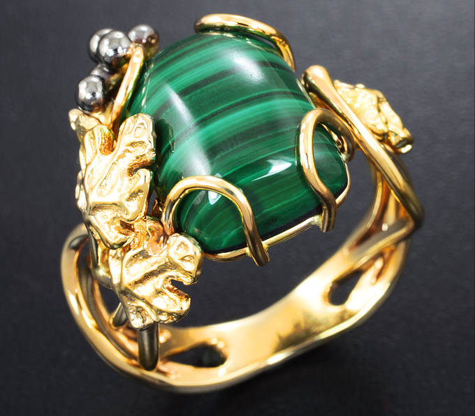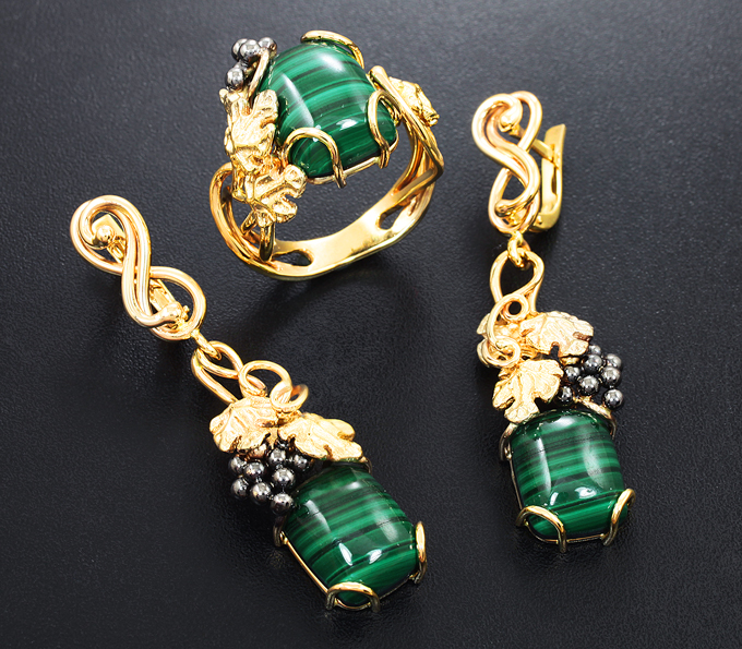 Вашему вниманию предлагается комплект (кольцо + серьги) из желтого золота 585 пробы с уральским малахитом на подложке из долерита! Изделия с частичным чернением. Вес комплекта 22,1 г.