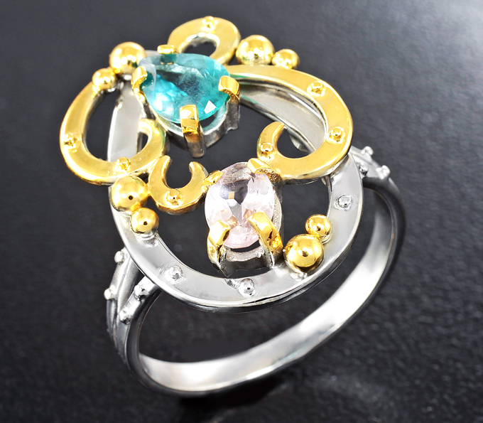 Вашему вниманию предлагается кольцо из стерлингового серебра (925 проба) c грандидьеритом и морганитом! Изделие частично позолочено. Размеры дополнительной инкрустации 7 х 5 мм. Площадка 23 х 16 мм, высота 5 мм. Вес изделия 4,7 г. Размер 18,5. Ниже приводятся ювелирные характеристики грандидьерита.