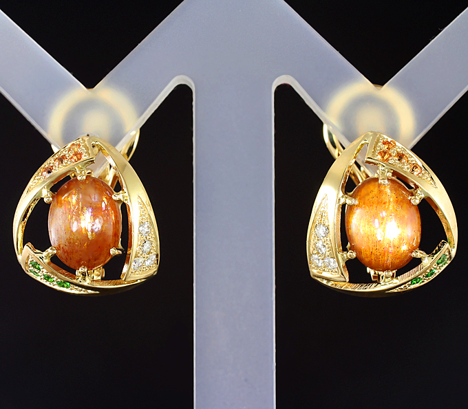 Вашему вниманию предлагаются серьги из желтого золота 585 пробы с солнечным камнем, цаворитами гранатами, оранжевыми сапфирами и бриллиантами! Диаметр дополнительной инкрустации 1,5 мм. Площадка серег 15 х 14 мм. Вес пары 5,5 г. Ниже приводятся ювелирные характеристики солнечного камня.