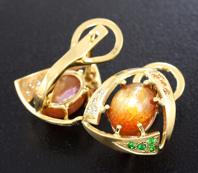 Серьги с солнечным камнем 4,49 карата, цаворитами гранатами, оранжевыми сапфирами и бриллиантами