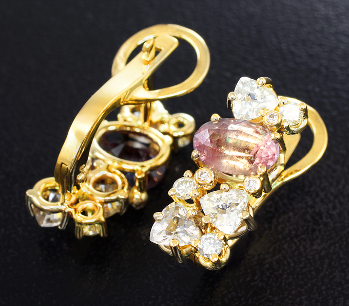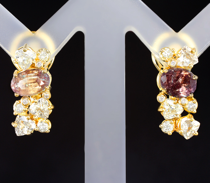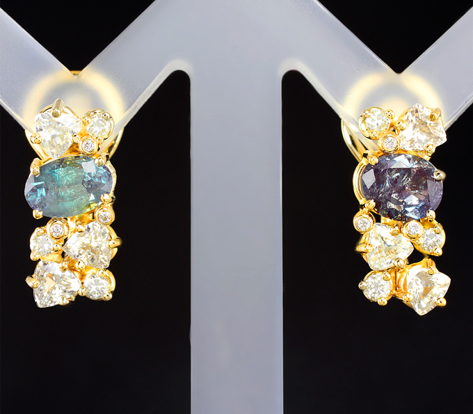 Вашему вниманию предлагаются серьги из желтого золота 585 пробы с уральскими александритами, муассанитами, бесцветными цирконами и бриллиантами! Диаметр дополнительной инкрустации 1,1 мм. Площадка серег 18 х 8 мм. Вес пары 5,1 г. Ниже приводятся ювелирные характеристики вставок.