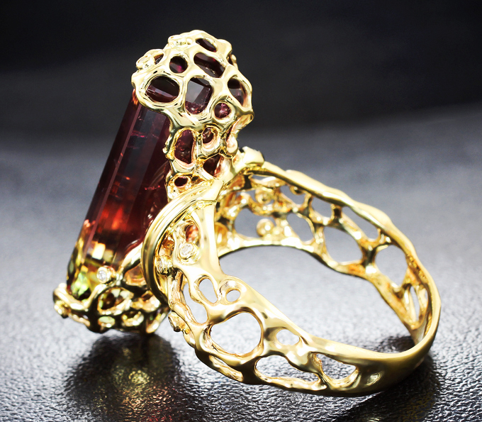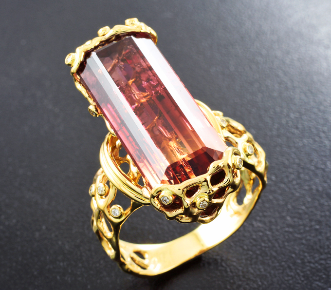 Кольцо с крупным арбузным турмалином 21,53 карата и бриллиантами