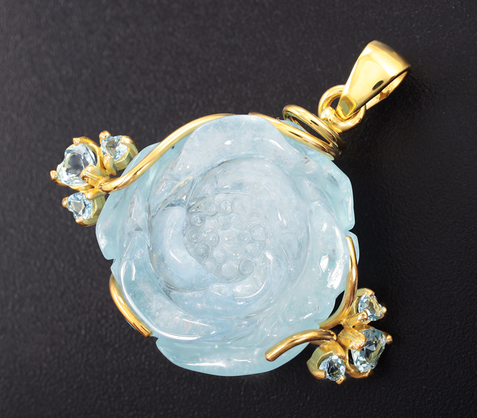 Кулон с миниатюрой «Цветок» из цельного аквамарина 53,29 карата и ограненными аквамаринами