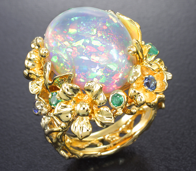 Кольцо с кристаллическим эфиопским опалом 8,45 карата, изумрудами и синими сапфирами