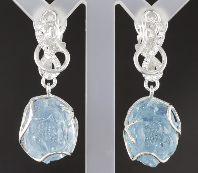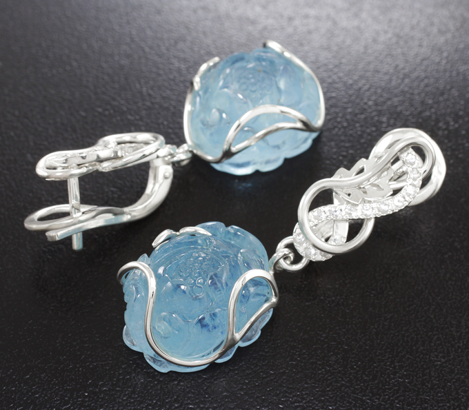 Серьги с резными аквамаринами 39 карата и лейкосапфирами