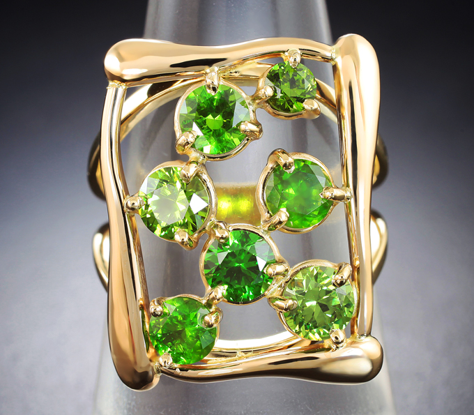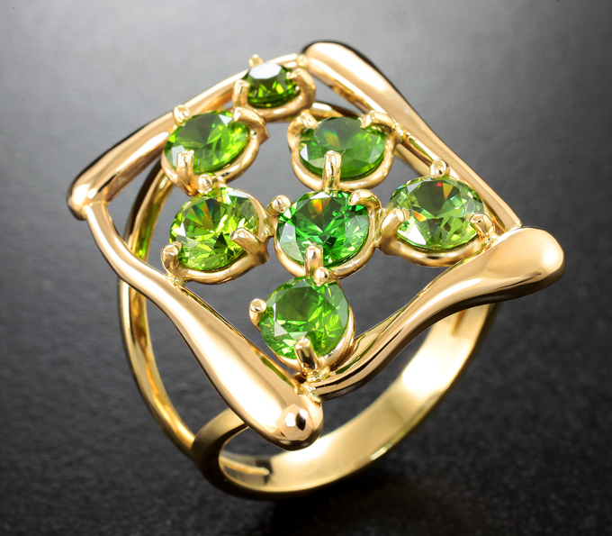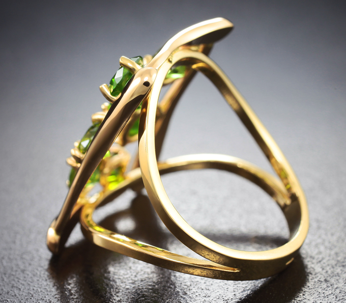 Вашему вниманию предлагается кольцо из желтого золота 585 пробы c демантоидами гранатами 3,14 карата! Размеры вставок от 3,58 х 2,55 мм до 4,92 х 3,4 мм. Площадка 24 х 19 мм, высота 4 мм. Вес изделия 7,1 г. Размер 19.