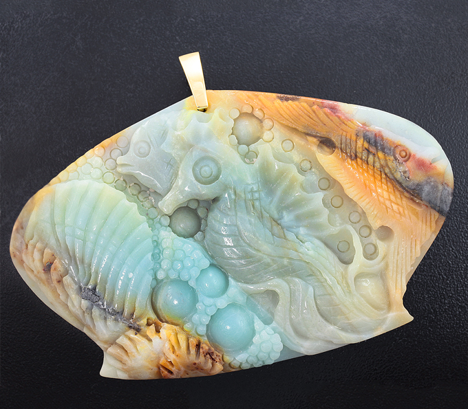 Камея-подвеска «Морской мир» из цельного куска амазонита с золотой петлей