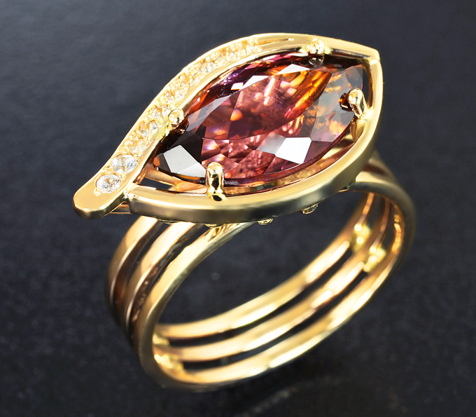 Вашему вниманию предлагается кольцо из желтого золота 585 пробы с полихромным турмалином авторской огранки и лейкосапфирами! Диаметр дополнительной инкрустации 1 мм до 1,3 мм. Площадка 20 х 11 мм, высота 8 мм. Вес изделия 5,2 г. Размер 17,25. Ниже приводятся ювелирные характеристики вставки.