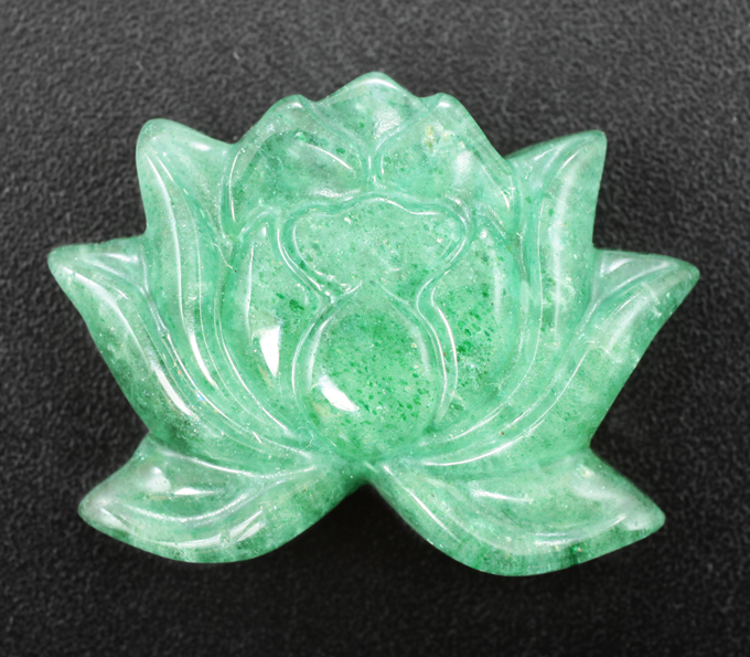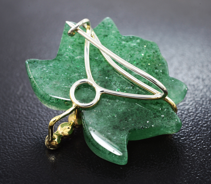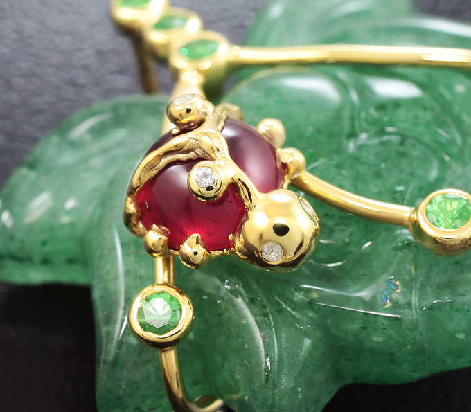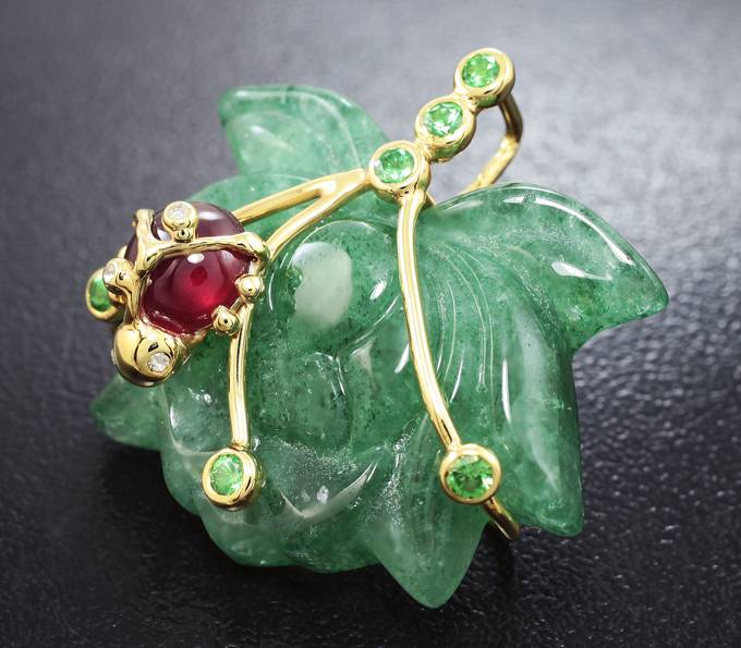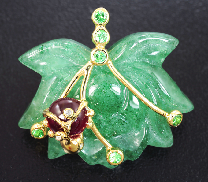 Кулон с миниатюрой «Лотос» из цельного зеленого кварца 32 карат, рубином 1,76 карата, цаворитами и бесцветными цирконами