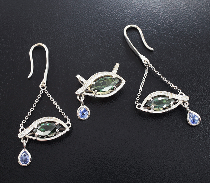 Комплект с гранатами со сменой цвета 3,42 карата, синими и бесцветными сапфирами