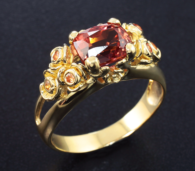 Кольцо с падпараджа турмалином 2,13 карата и оранжевыми сапфирами